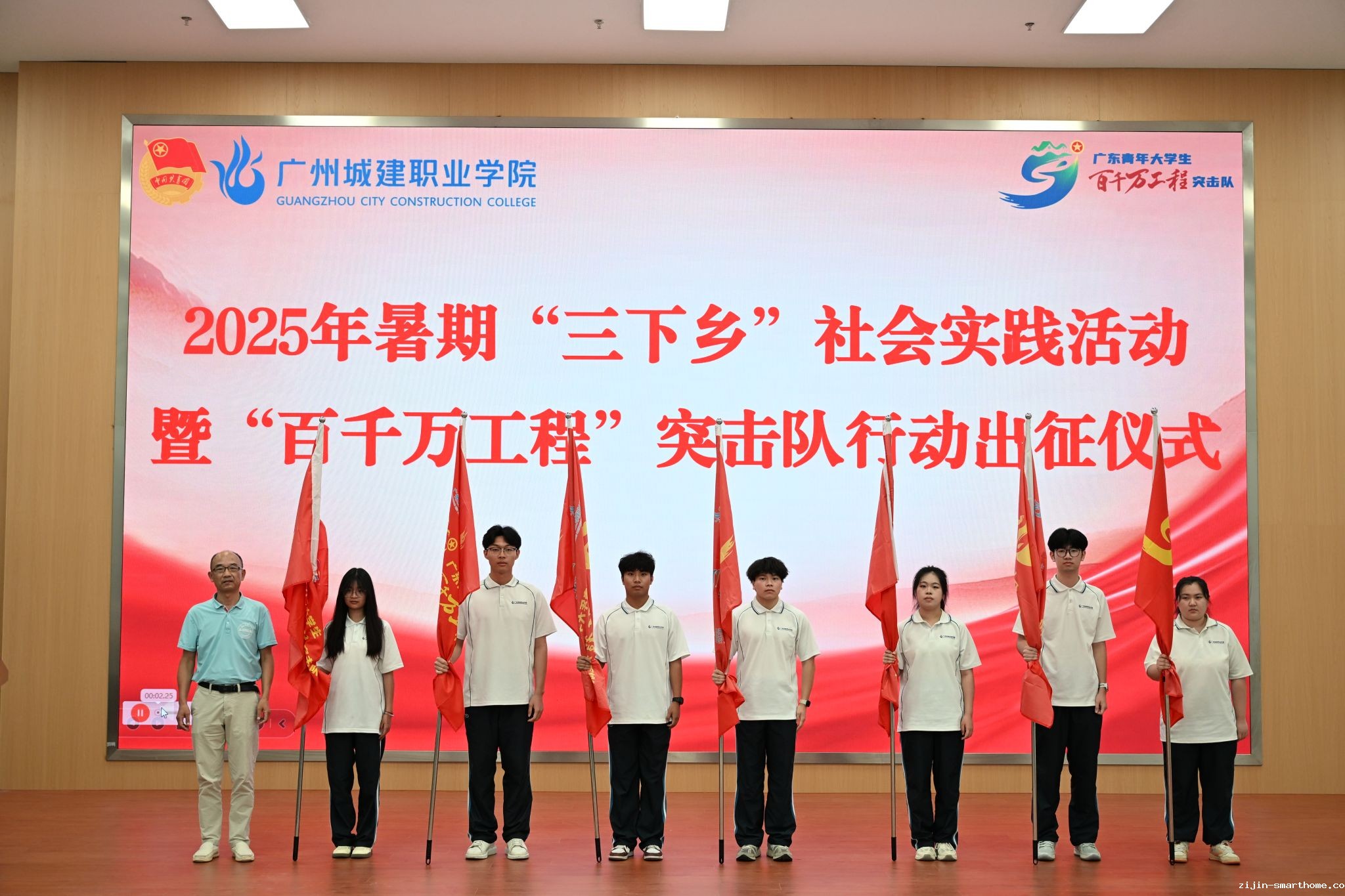 6月26日下午,我校2025年暑期“三下乡”社会实践活动暨“百千万工程”突击队行动出征仪式分别在广州校区人文艺术楼四楼报告厅、清远校区图书馆414报告厅同步举行。学校副校长、党委委员杨清国,校长助理、党委委员孔练光,党委委员、宣传部部长王艳君,团委书记兼党委学生工作部副部长甄伟文,学生处副处长曾德钦,各二级学院党组织副书记、副院长等学生工作负责人、团委书记以及70支实践团队指导老师和队员们共计650余人参加了出征仪式。